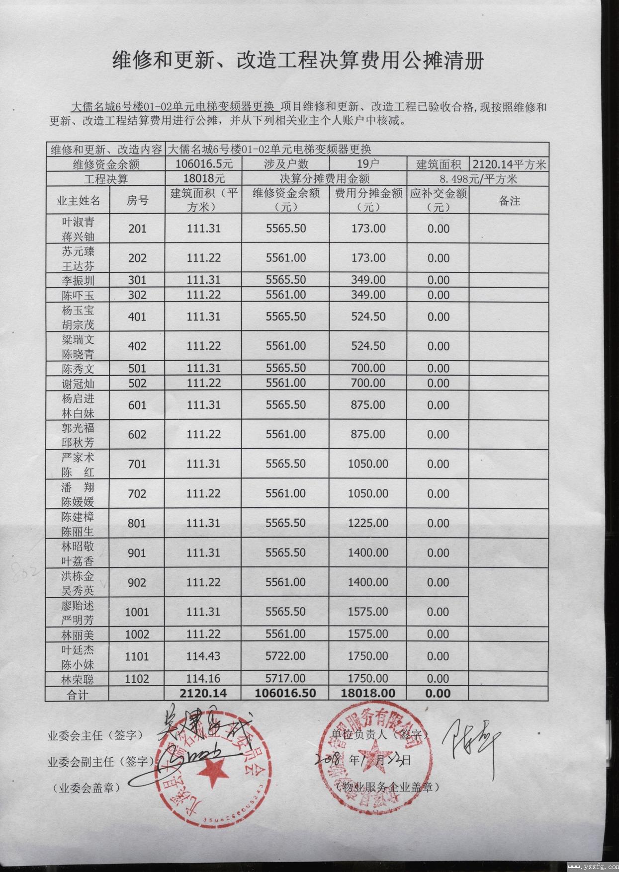 大儒名城6号楼1-2单元电梯维修和更新、改造工程决算费用公摊清册