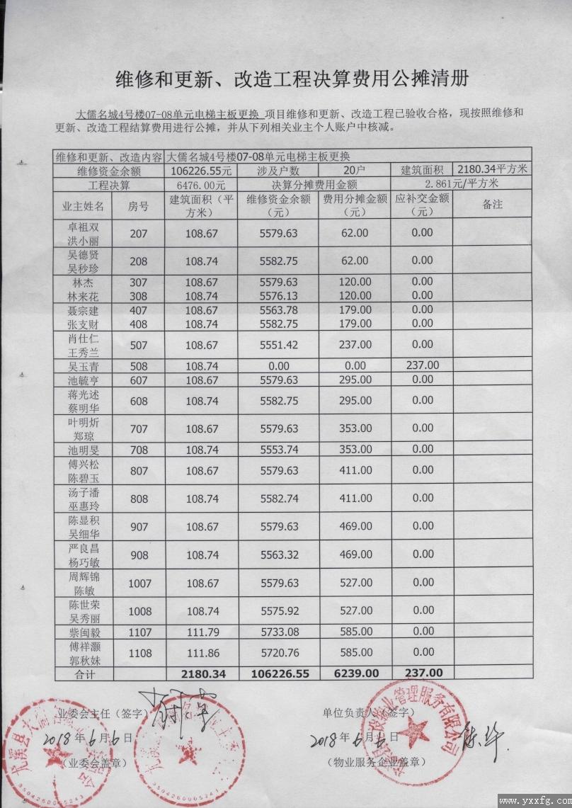 大儒名城4号楼7-8单元电梯维修和更新、改造工程决算费用公摊清册