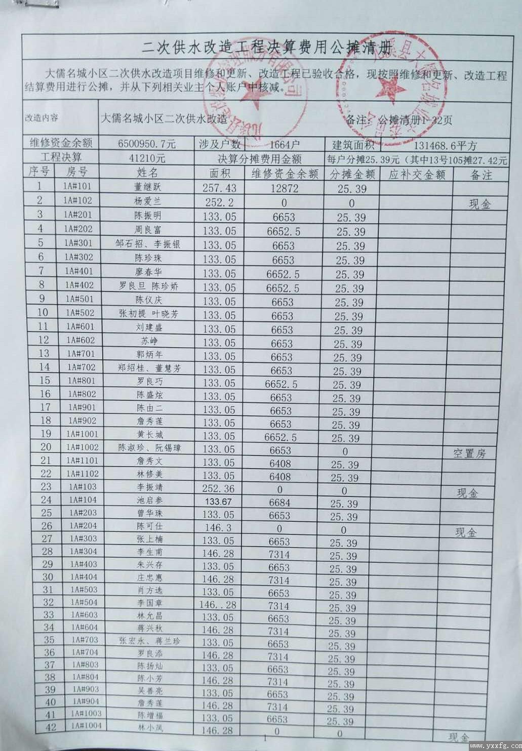 大儒名城小区二次供水系统维修和更新、改造工程决算费用公摊公示