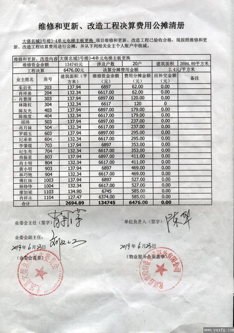 大儒名城3号楼3-4单元电梯维修和更新、改造工程决算费用公摊清册