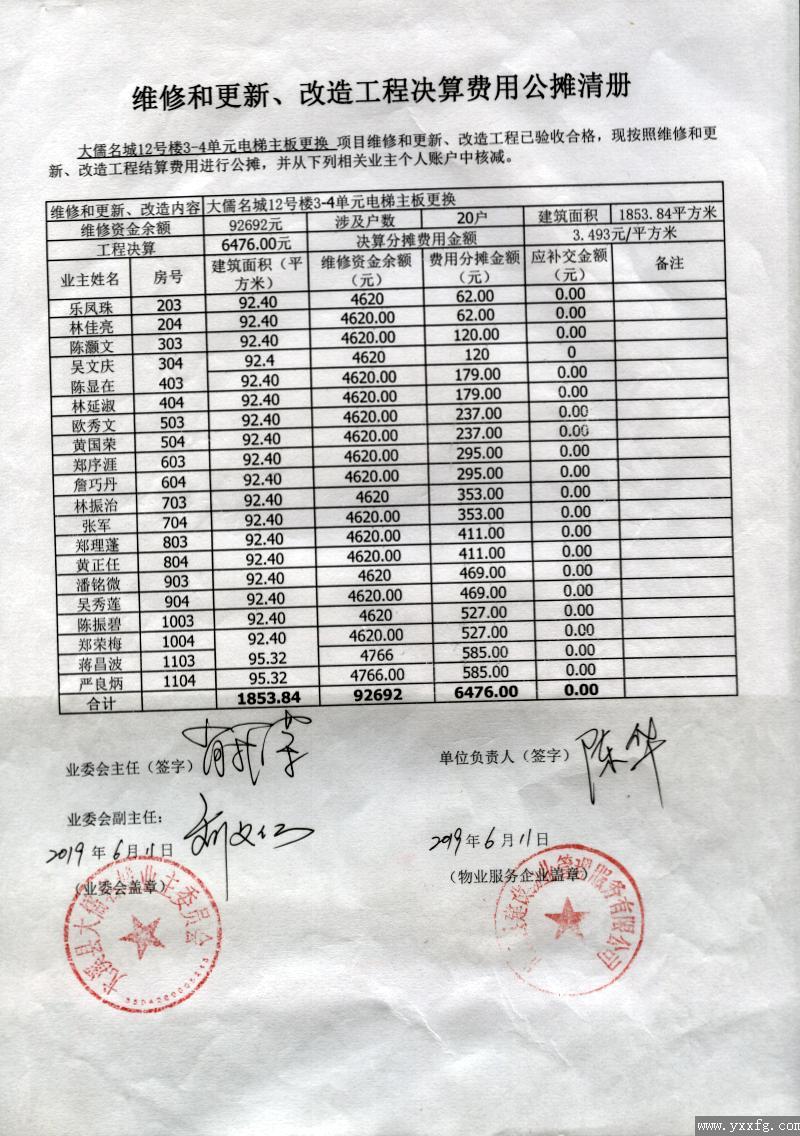 大儒名城12号楼3-4单元电梯维修和更新、改造工程决算费用公摊清册